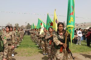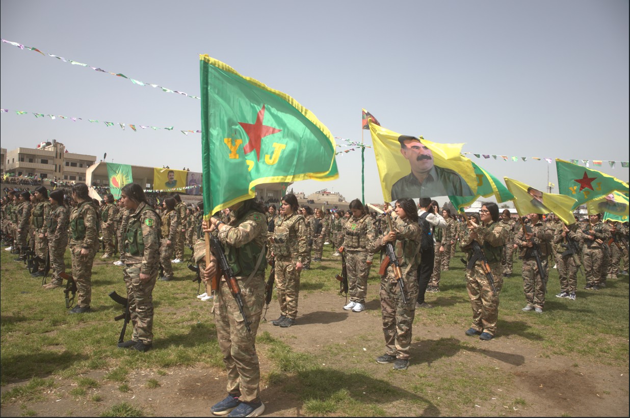 Piştî axaftina Newroz Ehmed dirûşmên ”Bijî Serok Apo”, “Jin Jiyan Azadî”, “Şehîd Namirin” û “Bijî Berxwedana YPJ’ê” hatin berzkirin.