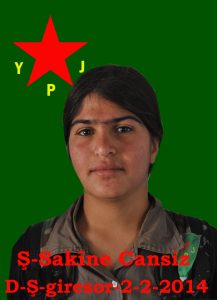 الاسم الحركي:ساكينة جانسز الاسم والكنية:دجلة عتو اسم الام:فاطمة اسم الاب:علي مكان وتاريخ الاستشهاد:كوباني-02.02.2014