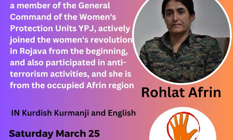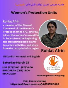 بدعوة من ناشطات ايرانيات لدعم حملة “مناهضة العنف ضد المرأة ستنضم القيادية روهلات عفرين الى الندوة الرقمية التي نظمتها الناشطات عبر تطبيق الزوم بتاريخ ٢٥-٣-٢٠٢٣ في الساعة الثامنة مساء حسب توقيت روج افا – دمشق، حيث سيدور النقاش حول دور وحدات حماية المراة في حماية النساء في شمال شرق سوريا وكذلك على اهمية الدور الذي تقوم به في مكافحة الارهاب .