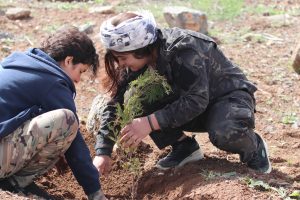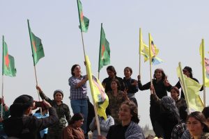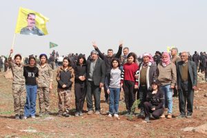 Female fighters of the Women’s Protection Units (YPJ) gathered today at Mishtanur Hill in Kobani to celebrate their 13th anniversary and the birthday of Abdullah Ocalan, raising his pictures and chanting, “Long live the leader’s resistance” and “Long live women’s resistance.”