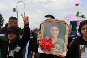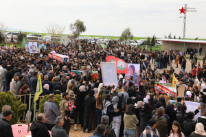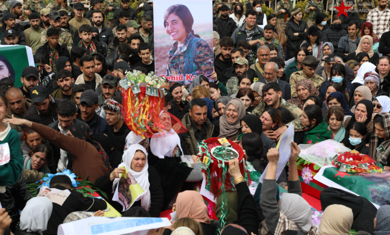 Hundreds of residents from the cities of Derik and Karaki Laki attended the funeral of the two female martyrs of freedom, Solin and Roken, and the martyr Mitan, as they were laid to rest at the Martyr Xebat Derik Cemetery.